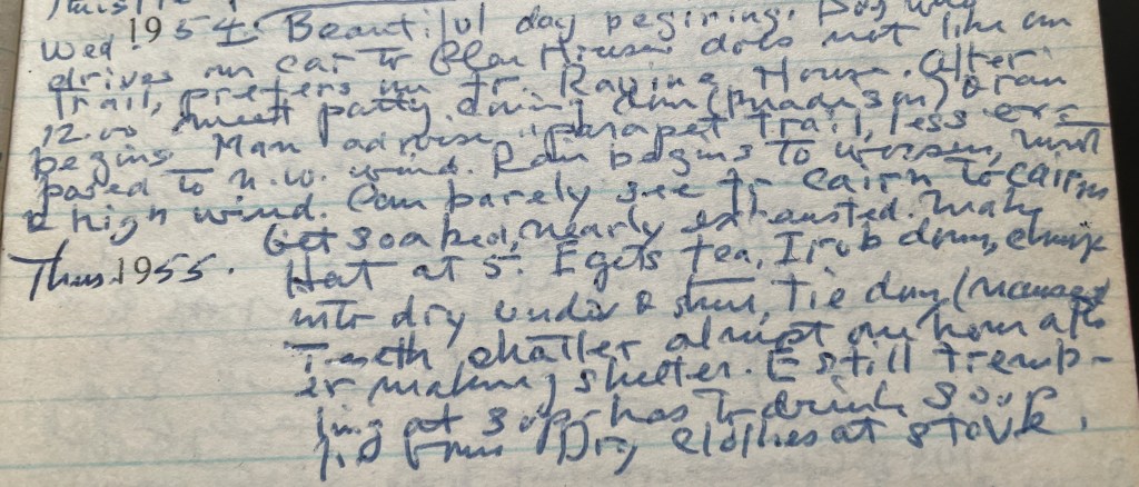 “Wed 1954 – Beautiful day beginning. Dog wagon drives our car to Blue House, dols mit line on trails, presters thru Ravine House. After 12:00 am at [???] (Parapet Trail, less exposed). Rain begins 1:30 pm, passed to N.W. wind. Rain begins to worsen, wind high + wind. Can barely see for cairn to cairn. Get soaked, nearly exhausted. Mushy.