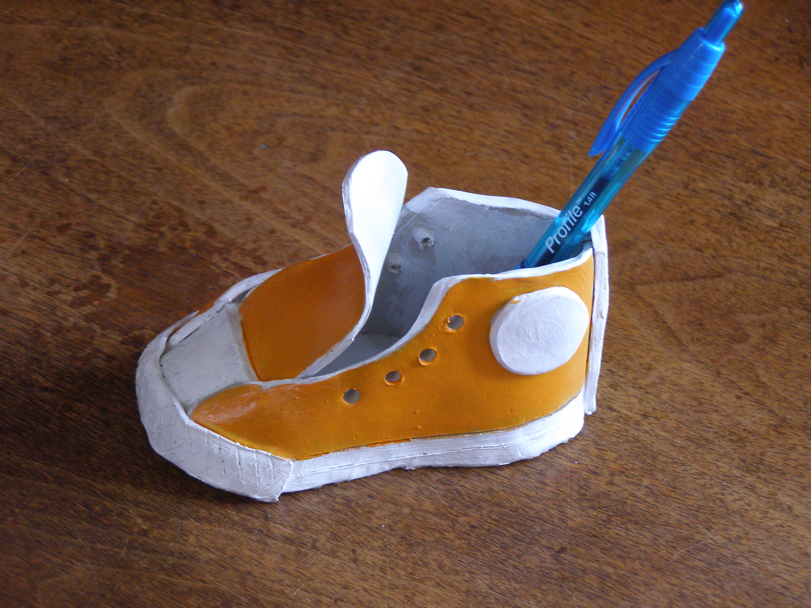 I had a great visit with HollyCornblog and CharlieHopbrew and will be sharing tidbits about it as time goes on. One thing I learned was that HollyCornblog was slightly offended that Pia Sundhage’s name was so much bigger than her own in the tag cloud. I tried to explain how that all works, but I don’t think that HollyCornblog was truly mollified. So please bear with me as I write numerous posts that include her name as a keyword .. and attempt to level the playing field. In the meanwhile, how do you like the cool … little sneaker that she made (and that I absconded with)? I think that she should make a bunch of ’em and sell them someplace, don’t you? This one is the Tennessee Lady Vol’s version! (Pen included, to give you a sense of the proportion of it.) I’m using it as a paperweight.