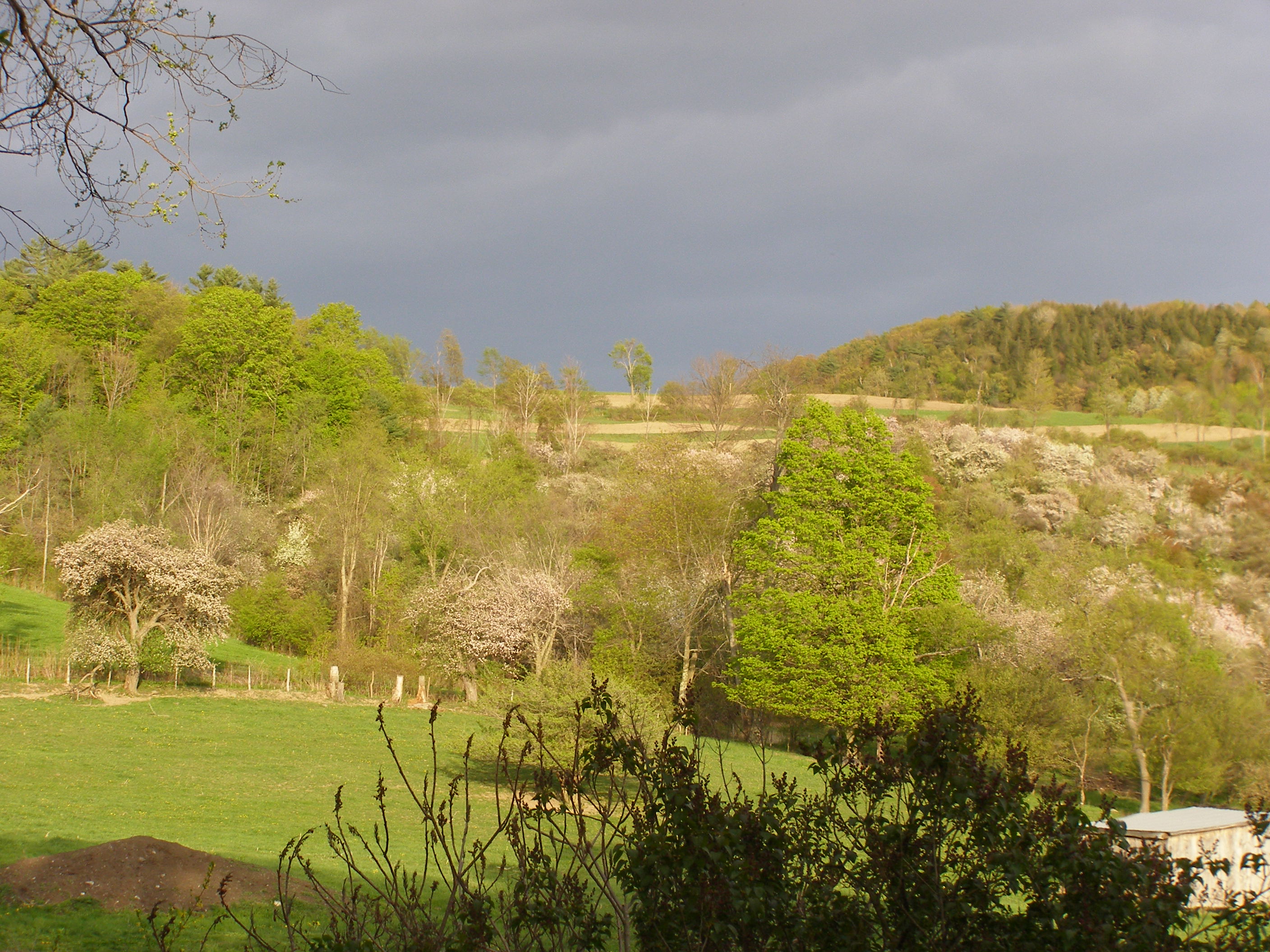 Saturday, after our work was done, we sat in front of their crackling chiminea, sampling some hopped up confections from around the country … and gazing up at the hill from below … while evening clouds rolled in, shadows lengthened, and apple blossom scent wafted down from the old, hillside orchard. Stay tuned for more on my visit … including a tour of some nearby castles!