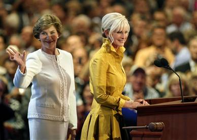 Cindy McCain and Laura Bush appeared together at the Republican convention yesterday and offered uplifting fare to the 17 delegates in attendance. In a surprisingly bold move, Cindy offered the following bit of wardrobe advice: “This is a time when we take off our Republican hats and put on our American hats.” Brave and inspiring words, indeed!
