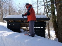 He is snowshoeing over a drift in the back yard that has nearly buried the woodshed.