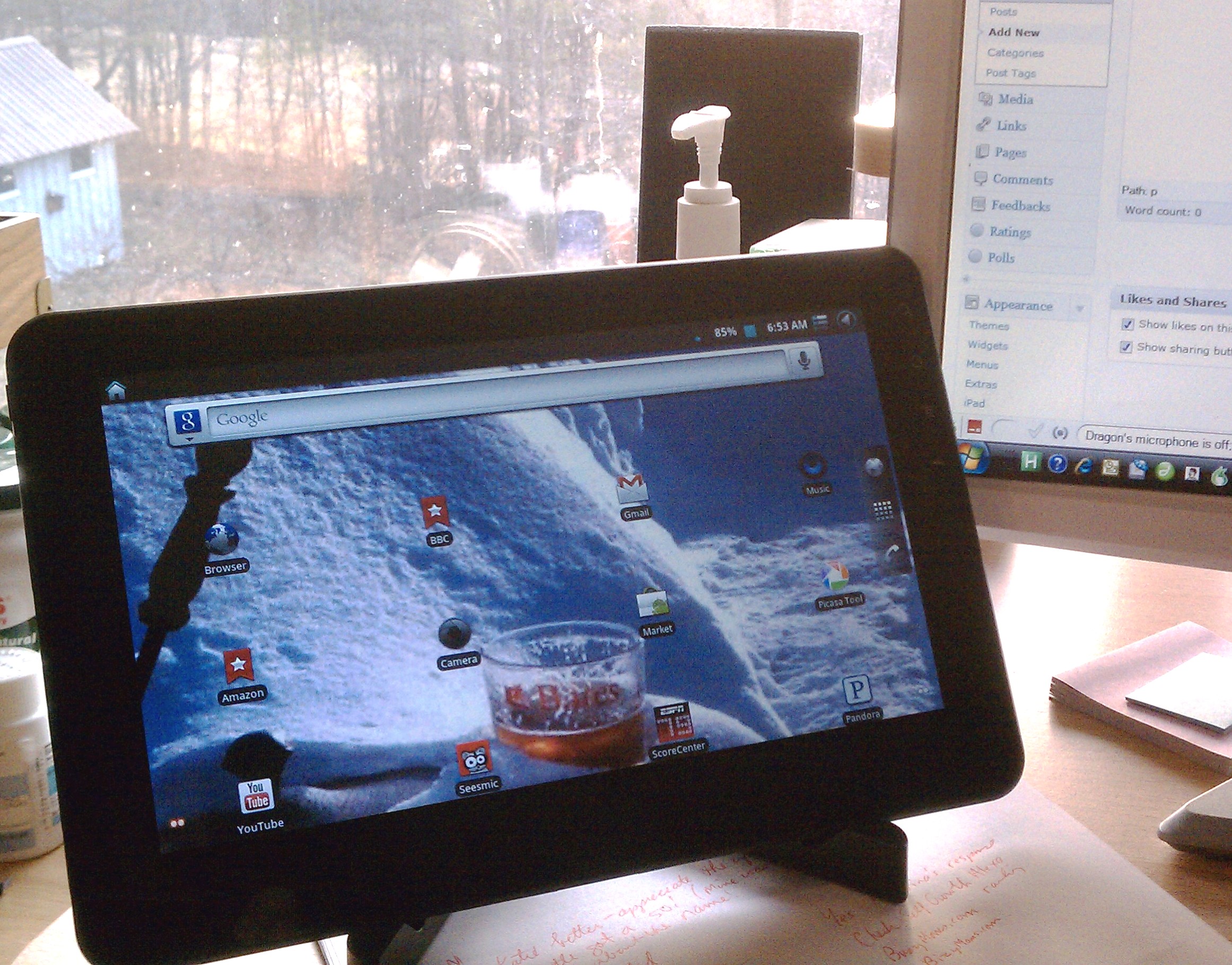 As you can see from the pictures I also got a little stand for it, which is pretty nifty. The only downside is that I haven’t yet figured out how to put shortcuts on my desktop, and haven’t wanted to explore the Internet for answers to that question. That’s not because I don’t think there are answers – but because I don’t want to lose half a day messing with the tablet – at least not right now.