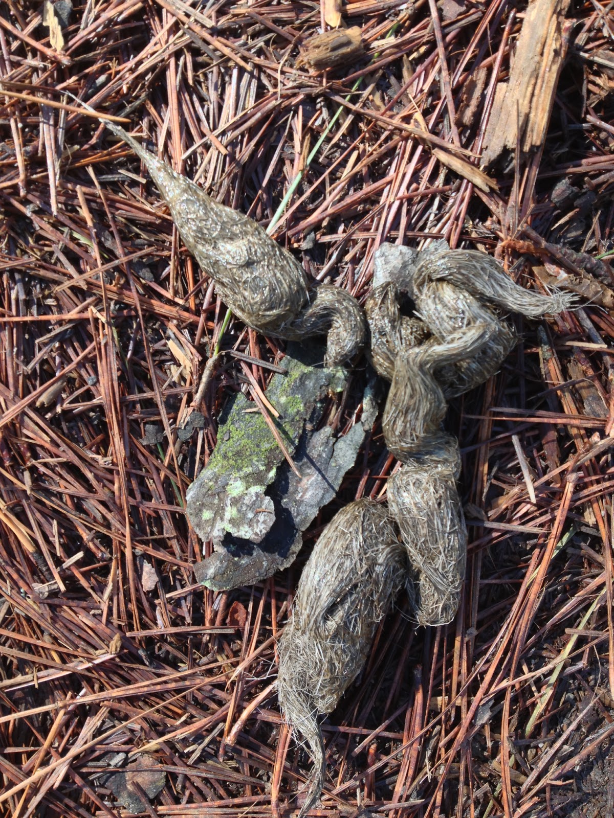 And this may actually be more information that you want, but there’s a lot of hair in it. Some poor creature(s) devoured by the ravening beast in our woods. Yikes! The photo here is from the web and is an approximation of our sample, albeit on pine needles rather than snow.