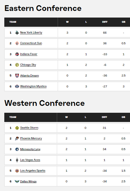 So in the WNBA most teams are three games into the Commissioner’s Cup. Here are the standings — with Caitlyn Clark and the Fever looking not too shabby. They won a nail-biter against the Mystics last night.